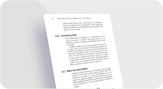 98 Personal Content Experience: Managing Digital Life in the Mobile Age company where the user works, it cannot be sent to e-mail addresses 25 that do not belong to the same organization. Further metadata may contain information, such as legal conditions and copyrights, which affect how to use that data. 4.5.6 Constructing Views The metadata plays an important role in constructing UI views to objects. For instance, it can help in selecting what objects are to be displayed, how they are organized, and what information per object is presented. In addition, metadata can be used for generating the UI layout. For example, Context Comic (Aaltonen et al. 2005) diary application uses metadata for selecting the personal content objects that belong to the diary and forming groups of objects based on diary events. For each event, the event’s importance is derived from metadata attributes of its objects (such as number of times that the object has been opened or sent) and the same information is used for selecting the object that visualizes the event. The application further scales images and places them on a grid on the basis of the event’s importance. 4.5.7 Better Recommendations Metadata could also fi ne-tune the recommendation systems by taking into account context and comments by others people who have similar preferences. For instance, in a movie recommendation service, you might favour ratings from people who have seen the same movies you liked. Metadata could also link the recommendations to the individuals who contributed them so that their digital reputation could affect the ranking. 4.5.8 Reusing / Remixing / Reconstructing Digital content readily lends itself to reuse, if the copyrights allow. Thanks to this, more and more of contemporary content are collages. Consider a typical music video on Music TV. Often the music track is created using dozens of sound samples obtained from commercial sound libraries, and the same may apply to the video fi les and visual effects. The metadata in these fi les may retain references to the original 25 Which may not be quite what you want if, for instance, you are sending some promotion material to your customers. Unfortunately, simple constraints like this will often fail with the complex situations found in everyday life.
