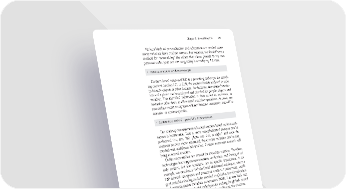 Chapter 8: Timeshifting Life 327 Various kinds of personalization and adaptation are needed when using metadata from multiple sources. For instance, we should have a method for “normalizing” the values that others provide to my own personal scale: your one star song rating is actually my 1.8 stars. • Metadata semantics vary between people Content-based retrieval (CBR) is a promising technique for search- ing content (section 5.2). In CBR, the content itself is analyzed in order to identify objects or other features. For instance, the visual character- istics of a photo can be analyzed and checked for people, objects, and weather. The identifi ed information is then stored as metadata, in textual or other form, to allow rapid machine operations. As usual, any successful content recognition will not function universally, but will be domain- or context-specifi c. • Content-based retrieval is powerful in limited domains The roadmap towards more advanced content-based retrieval tech- niques is incremental. That is, some unsophisticated analyses can be performed fi rst, say, “this photo was shot at night,” and once the methods become more advanced, the created metadata can be aug- mented with additional information. Context-awareness research will bring in several enablers. Online communities are crucial for metadata creation. Therefore, technologies that support easy creation, verifi cation, and sharing of not only content, but also metadata, are of specifi c importance. As an example, we envision a “Whole Earth” distributed catalogue, where a P2P network recognizes and annotates content. Furthermore, intelli- gent metadata sharing could be enabled by global author identifi cation and personal global metadata namespaces (RDF). It is also likely that we will have good and solid techniques for making the globally shared metadata anonymous, or verinymous, depending on the situation. • P2P indexes world’s content However, communities may produce more than just mere meta- data. Communities may be harnessed to provide entire ontologies on specifi c domains, especially once the payoff is high enough. Even today, user-contributed ontologies provide semantics for restricted 1 domains (for instance, the dmoz open directory project (ODP) had 1 http://www.dmoz.org/