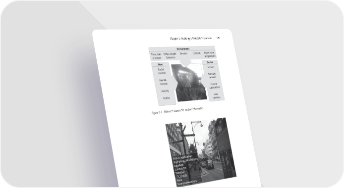 Chapter 5: Realizing a Metadata Framework 143 Figure 5-1. Different sources for context information. Figure 5-2. Context as metadata. information, including location as GPS coordinates or the network cell ID, all detected Bluetooth IDs, the current song playing in the media player, a link to the calendar entry for the day, and battery and network fi eld strengths. The purpose is to capture as much as possible of the situation and associate it with the content object. We call storing the situation capturing the context as metadata for the new content object. To us, any framework managing metadata must also be able to capture and store context.