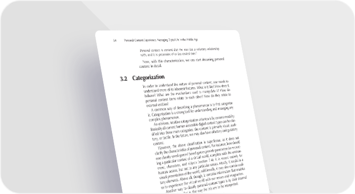 54 Personal Content Experience: Managing Digital Life in the Mobile Age Personal content is content that the user has a voluntary relationship 6 with, and is in possession of or has control over. Now, with this characterization, we can start discussing personal content in detail. 3.2 Categorization In order to understand the nature of personal content, one needs to understand more of its inherent features. What is it like? How does it behave? What are the mechanisms used to manipulate it? How do personal content items relate to each other? How do they relate to external entities? A common way of describing a phenomenon is to fi rst categorize it. Categorization is a strong tool for understanding and managing any complex phenomenon. An obvious, intuitive categorization criterion is by content modality. Basically all current human-accessible digital content types can be clas- sifi ed into three main categories: the content is primarily visual, audi- tory, or tactile. In the future, we may also have olfactory and gustatory content. However, the above classifi cation is superfl uous, as it does not clarify the characteristics of personal content. For instance, how should one classify saved games? Saved games provide parameters for recreat- ing a particular context of a virtual world, complete with the environ- ment, characters, and objects (section 7.4). It is meant entirely for human access, but not to any particular senses. Mostly, it results in a visual presentation of the world; additionally, it may also contain audi- tory elements. Above all, though, it contains information that enables us to experience the virtual world with our senses and imagination. Another way to classify personal content types is by their internal representation, that is, the way the bits are to be interpreted: • text: SMS, e-mail, e-books, chat session logs; • images: photos, drawings, scanned paintings; • audio: music, ring tones, earcons; • video: movies, clips. With this kind of classifi cation, however, we will quickly run out of higher-level terms; for any content type arranged differently from the 6 And then again, when your partner asks you to take yet another photo of yet another fabulous sunset, the voluntary nature of the content experience is to be doubted.