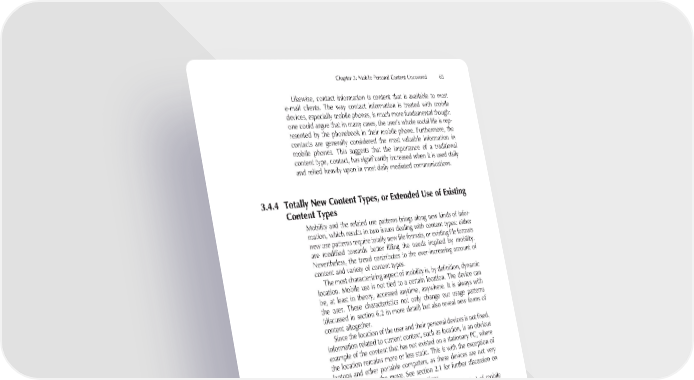 Chapter 3: Mobile Personal Content Uncovered 65 Likewise, contact information is content that is available to most e-mail clients. The way contact information is treated with mobile devices, especially mobile phones, is much more fundamental though: one could argue that in many cases, the user’s whole social life is rep- resented by the phonebook in their mobile phone. Furthermore, the contacts are generally considered the most valuable information in mobile phones. This suggests that the importance of a traditional content type, contact, has signifi cantly increased when it is used daily and relied heavily upon in most daily mediated communications. 3.4.4 Totally New Content Types, or Extended Use of Existing Content Types Mobility and the related use patterns brings along new kinds of infor- mation, which results in two issues dealing with content types: either new use patterns require totally new fi le formats, or existing fi le formats are modifi ed towards better fi lling the needs implied by mobility. Nevertheless, the trend contributes to the ever-increasing amount of content and variety of content types. The most characterizing aspect of mobility is, by defi nition, dynamic location. Mobile use is not tied to a certain location. The device can be, at least in theory, accessed anytime, anywhere. It is always with the user. These characteristics not only change our usage patterns (discussed in section 6.2 in more detail) but also reveal new forms of content altogether. Since the location of the user and their personal devices is not fi xed, information related to current context, such as location, is an obvious example of the content that has not existed on a stationary PC, where the location remains more or less static. This is with the exception of laptops and other portable computers, as these devices are not very useable while on the move. See section 2.1 for further discussion on static, nomadic, and mobile use situations. Personalized location-dependent information is typical of mobile use only. Such content includes your own location, the location of your friends, location-dependent personal reminders, and location-based services, such as advertisements. Applications that deal with location- based personal content are discussed in section 7.2. Another example is presence (or availability) information, which is traditionally used in instant messaging applications (International Society for Presence Research 2006). In traditional PC environments, a presence indicator and its associated text merely conveys whether you are available at your PC, busy working, or away from your PC.