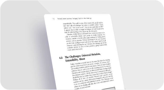 116 Personal Content Experience: Managing Digital Life in the Mobile Age unpredictable. This could be one of the reasons why people tend to start their calls with dialogue that serves to establish context: “Guess where I am,” “Are you in a car?”, “Are you in a good place to talk?” It appears that in order to engage in dialogue, we need to gain some kind of understanding of the context on the other party. Likewise, mobile devices will benefi t from context awareness to be able to successfully interact with people in mobile situations. For instance, consider a mobile yellow page catalogue for fi nding nearby services, such as pizzerias. Without knowledge of the user’s location, an electronic catalogue is not much better than a paper-based manual. However, upon knowing the user’s location, the catalogue can sort the available services in terms of their proximity, giving fundamentally more useful information. 4.8 The Challenges: Universal Metadata, Extensibility, Abuse Today, metadata is mostly local, in the sense that often the meaning gets lost when moved from one system to another. In contrast, univer- sal metadata would be useful in more places. There are some metadata attributes that are used in next to all computing systems. For instance, fi lenames and creation dates are often retained when moving content fi les between systems. Still the dates may be interpreted differently – should the date be creation date, access date, or date of latest change? Perhaps all of them are needed. Filenames get truncated, version numbers are lost, creator information disappears, and so on. And this is just on a relatively well established concept – fi les. Things get worse when we are dealing with data that is less well understood, such as models of social networks. NOT A GOOD MATCH Cathy is again uploading scans of her paintings to their Web site. It really stinks that she has to use dedicated applications for each different task: scanning the paintings to her computer, browsing, editing, and sending the images. What’s funny is that the scanner and the editor have different ideas of image orientation, so she always has to manually rotate each image before editing. Also she has not been able to fi gure out how to set the image size properly. If she prints drafts from the editor, it comes out in the right size, but after uploading those tiny little postcards somehow want to be huge wall-size sheets of enlarged pixels.