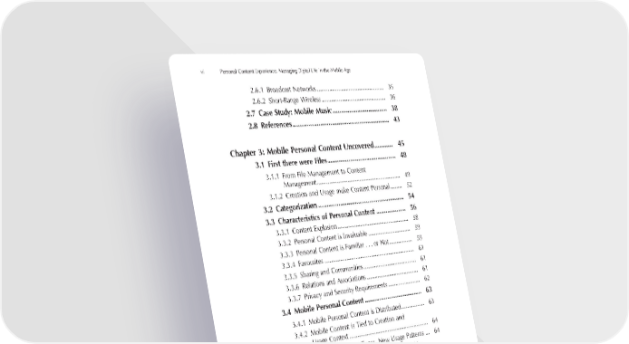 vi Personal Content Experience: Managing Digital Life in the Mobile Age 2.6.1 Broadcast Networks ............................................. 35 2.6.2 Short-Range Wireless ........................................... 36 2.7 Case Study: Mobile Music .................................. 38 2.8 References ........................................................... 43 Chapter 3: Mobile Personal Content Uncovered ........... 45 3.1 First there were Files........................................... 48 3.1.1 From File Management to Content Management ........................................................ 49 3.1.2 Creation and Usage make Content Personal ........ 52 3.2 Categorization ..................................................... 54 3.3 Characteristics of Personal Content ................... 56 3.3.1 Content Explosion ................................................ 58 3.3.2 Personal Content is Invaluable ............................. 59 3.3.3 Personal Content is Familiar . . . or Not ................ 59 3.3.4 Favourites ............................................................ 61 3.3.5 Sharing and Communities .................................... 61 3.3.6 Relations and Associations ................................... 61 3.3.7 Privacy and Security Requirements ...................... 62 3.4 Mobile Personal Content .................................... 63 3.4.1 Mobile Personal Content is Distributed ................ 63 3.4.2 Mobile Content is Tied to Creation and Usage Context ..................................................... 64 3.4.3 The Same Content Types, New Usage Patterns ... 64 3.4.4 Totally New Content Types, or Extended Use of Existing Content Types ..................................... 65 3.4.5 New Behavioural Patterns .................................... 66 3.4.6 New Challenges ................................................... 67 3.5 Content Wants to be Free? ................................. 67 3.6 GEMS, a Tool for Modelling Personal Content Experience ............................................. 72 3.7 References ........................................................... 76