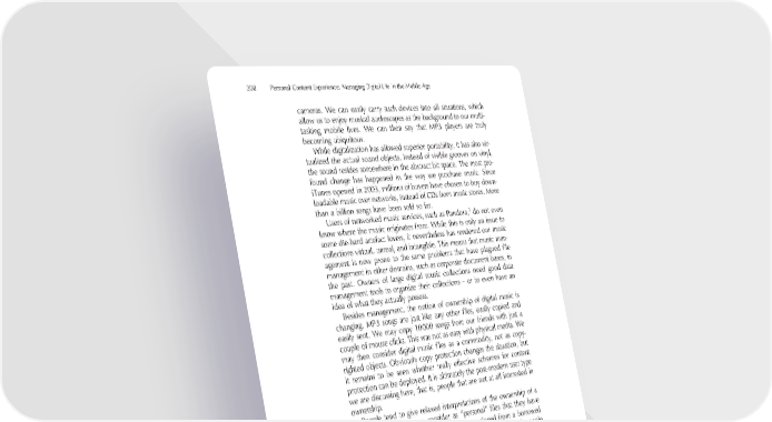 208 Personal Content Experience: Managing Digital Life in the Mobile Age cameras. We can easily carry such devices into all situations, which allow us to enjoy musical audioscapes as the background to our multi- tasking mobile lives. We can then say that MP3 players are truly becoming ubiquitous. While digitalization has allowed superior portability, it has also vir- tualized the actual sound objects. Instead of visible grooves on vinyl, the sound resides somewhere in the abstract bit space. The most pro- found change has happened in the way we purchase music. Since iTunes opened in 2003, millions of buyers have chosen to buy down- loadable music over networks, instead of CDs from music stores. More than a billion songs have been sold so far. 3 Users of networked music services, such as Pandora, do not even know where the music originates from. While this is only an issue to some die-hard artefact lovers, it nevertheless has rendered our music collections virtual, unreal, and intangible. This means that music man- agement is now prone to the same problems that have plagued fi le management in other domains, such as corporate document bases, in the past. Owners of large digital music collections need good data management tools to organize their collections – or to even have an idea of what they actually possess. Besides management, the notion of ownership of digital music is changing. MP3 songs are just like any other fi les, easily copied and easily sent. We may copy 10 000 songs from our friends with just a couple of mouse clicks. This was not as easy with physical media. We may then consider digital music fi les as a commodity, not as copy- righted objects. Obviously copy protection changes the situation, but it remains to be seen whether really effective schemes for content protection can be deployed. It is ultimately the post-modern user type we are discussing here, that is, people that are not at all interested in ownership. People tend to give relaxed interpretations of the ownership of a music object. They may consider as “personal” fi les that they have downloaded from a fi le sharing network, or ripped from a borrowed CD. No matter how the actual ownership of music is defi ned, people still form personal relations with the objects. For instance, my favourite tune playing on a radio channel is “mine” in the sense that I consider it important to me – even if I do not own the object. Our notion of personal content includes “metacontent”, which talks about other pieces of content. For instance, playlists, song ratings, and artist recommendations all serve as qualifi cations of music objects. 3 http://www.pandora.com/
