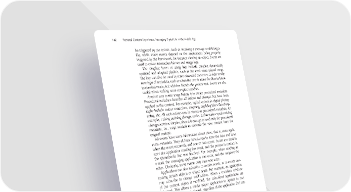 148 Personal Content Experience: Managing Digital Life in the Mobile Age be triggered by the system, such as receiving a message or deleting a fi le, while many events depend on the applications being properly triggered by the framework, for instance viewing an object. Events are used to create interaction history and usage logs. The simplest forms of using logs include creating dynamically updated and adapted playlists, such as the most often played songs. The logs can also be used by more advanced harvesters to infer totally new type of metadata, such as when the user is alone she likes to listen to classical music, but with her friends she prefers rock. Events are also useful when making more complex searches. Another way to use usage history is to create procedural metadata. Procedural metadata describes all actions and changes that have been applied to the content. For example, typical actions in digital photog- raphy include colour corrections, cropping, applying fi lters like sharp- ening, etc. All such actions can be stored as procedural metadata, for example, making undoing changes easier. It also makes synchronizing changed content simpler, since it is enough to send only the procedural metadata, i.e., steps needed to recreate the new content from the original content. All events have some information about them, that is, once again, meta-metadata. They all have timestamps to store the date and time when the event occurred, and one or two actors. Actors are used to store the application creating the event, and the person (a contact in the phonebook) that was involved. For example, when sending an e-mail, the messaging application is one actor, and the recipient the other. Obviously, some events only have one actor. Applications can also subscribe to certain events, or to events con- cerning certain objects or object types. For example, an application may subscribe to change notifi cations. When a metadata attribute of the content object is modifi ed, the subscribed applications are informed. This allows a media player application to update its user interface when a song is played, regardless of the application that was used to play the song. 5.4 From Content Management to Metadata Management We have discussed some of the key issues in content management in a distributed mobile environment, and presented a classifi cation scheme for different types of metadata. We pointed out that mobile personal content is by its very nature distributed across many devices.