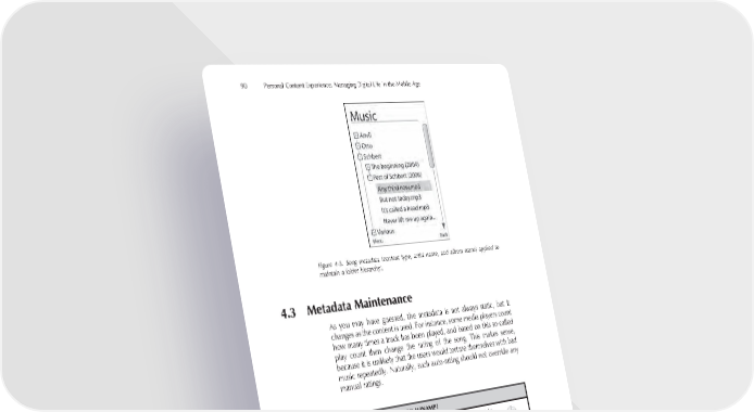90 Personal Content Experience: Managing Digital Life in the Mobile Age Figure 4-5. Song metadata (content type, artist name, and album name) applied to maintain a folder hierarchy). 4.3 Metadata Maintenance As you may have guessed, the metadata is not always static, but it changes as the content is used. For instance, some media players count how many times a track has been played, and based on this so-called play count then change the rating of the song. This makes sense, because it is unlikely that the users would torture themselves with bad music repeatedly. Naturally, such auto-rating should not override any manual ratings. TO WINAMP OR NOT TO WINAMP? Eddie fi nally came in with his portable disk and uploaded his 85GB collection of MP3 fi les into her computer. Okay, it might be illegal, but who cares – everybody’s doing it. Eddie looked at her importing the MP3 fi les into iTunes, Angie’s favourite player, and suggested that she switch to Winamp, which is just a way cooler piece of software. Angie wasn’t sure. Eddie explained that he had all those carefully crafted playlists for Winamp, mixing the fi les he just gave to Angie into really spacey all-night sessions, and Angie should really try it out. Angie did install Winamp with Eddie and has opened it a few times since then. She still doesn’t know . . . well, in fact she does. That software just doesn’t feel right to her. What’s worse, Angie has spent years in rating her song fi les with