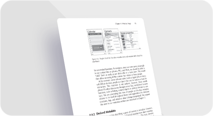 Chapter 4: Metadata Magic 93 Figure 4-6. People should be fi rst-class metadata items; all metadata fi elds should be interlinked. for automated functions. For instance, since we store names of people in our contact lists on phones, PCs, and PDAs, we should be able to “click” them as easily as we click a fi le or a menu item. This would then allow accessing all the content that relates to these people. At the moment, some software suites (such as Apple iLife or Micro- soft Offi ce) do treat people as objects that can be used as a basis for interaction. This treatment is not uniform, however. Most mobile phone UIs allow data access through contact lists, but fall short in some functions, such as linking content objects in arbitrary formats to con- tacts. We are promoting this view of people as fi rst-class metadata citizens to be used throughout device and application UIs, database structures, logs, and wherever data is being manipulated. We expand this view in our metadata architecture described in Chapter 5. 4.4.2 Derived Metadata All information describing a piece of content is metadata. However, as we wish to separate a special kind of metadata from other metadata, we call this metadata subset derived metadata. This term denotes metadata that not only talks about other data, but has been derived from other data through automated means. The relation of metadata and derived metadata could be described as: • Metadata is direct data description: image resolution, bit rate of audio fi le, or a thumbnail image are typical instances of direct metadata. • Derived metadata is indirect metadata: it may describe the links (associations) between objects, or contain some information calcu- lated from direct metadata. For instance, the collection that an