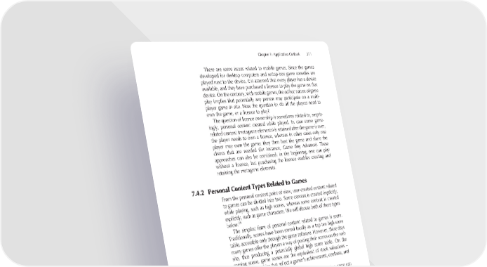 Chapter 7: Application Outlook 311 There are some issues related to mobile games. Since the games developed for desktop computers and settop-box game consoles are played next to the device, it is assumed that every player has a device available, and they have purchased a licence to play the game on that device. On the contrary, with mobile games, the ad hoc nature of game play implies that potentially any person may participate on a multi- player game in situ. Now the question is: do all the players need to own the game, or a licence to play? The question of licence ownership is sometimes related to, surpris- ingly, personal content created while played. In case some game- related content (metagame elements) is retained after the game is over, the player needs to own a licence, whereas in other cases only one player may own the game; they then host the game and share the clients that are needed (for instance, Game Boy Advance). These approaches can also be combined: in the beginning, one can play without a licence, but purchasing the licence enables creating and retaining the metagame elements. 7.4.2 Personal Content Types Related to Games From the personal content point of view, user-created content related to games can be divided into two. Some content is created implicitly, while playing, such as high scores, whereas some content is created explicitly, such as game characters. We will discuss both of these types 28 below. The simplest form of personal content related to games is score. Traditionally, scores have been stored locally as a top-ten high-score table, accessible only through the game software. However, these days many games offer the players a way of posting their scores on the web site, thus producing a potentially global high score table. On the gaming scene, game scores are the equivalent of stock valuations – important quantities that refl ect a gamer’s achievement, coolness, and prestige. In addition to achieved scores, the current situation in a game can also be stored. This is referred to as a saved game. In the most simple form, the game is saved locally on a mass storage device, where it can be later retrieved, allowing the player to continue gameplay from the last saved position. There are two basic approaches to saving games: either the player is free to save the game at any time, or alternatively, 28 Please note that in most domains the same division between explicit and implicit content creation applies. However, with games it is perhaps more clear than in others (Chapter 3).