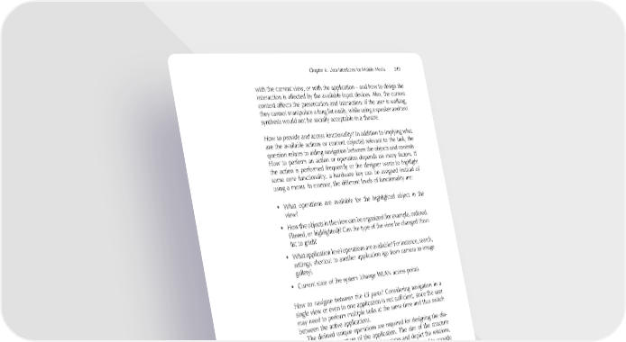 Chapter 6: User Interfaces for Mobile Media 249 with the current view, or with the application – and how to design the interaction is affected by the available input devices. Also, the current context affects the presentation and interaction: if the user is walking, they cannot manipulate a long list easily, while using a speaker and text synthesis would not be socially acceptable in a theatre. How to provide and access functionality? In addition to implying what are the available actions or content object(s) relevant to the task, the question relates to aiding navigation between the objects and controls. How to perform an action or operation depends on many factors. If the action is performed frequently or the designer wants to highlight some core functionality, a hardware key can be assigned instead of using a menu. In essence, the different levels of functionality are: • What operations are available for the highlighted object in the view? • How the objects in the view can be organized (for example, ordered, fi ltered, or highlighted)? Can the type of the view be changed (from list to grid)? • What application level operations are available? For instance, search, settings, shortcut to another application (go from camera to image gallery). • Current state of the system (change WLAN access point). How to navigate between the UI parts? Considering navigation in a single view or even in one application is not suffi cient, since the user may need to perform multiple tasks at the same time and thus switch between the active applications. The defi ned unique operations are required for designing the dia- logue and the structure of the application. The aim of the structure specifi cation is to place operations into states and depict the relations, or required navigation steps, between them. It is essential to provide fast and easy access to primary tasks(s) and related operations and thus, the main operations should be performed in the primary (main) state. Secondary operations, which support performing the main task(s) or are performed less frequently, are divided into secondary states. The structure of the user interface can be visualized with a dialogue diagram that presents the states and related operations and transitions (relations) between the states. In order to illustrate the design process, we now consider a fi ctional dedicated music player device for sporty users. The device is strictly