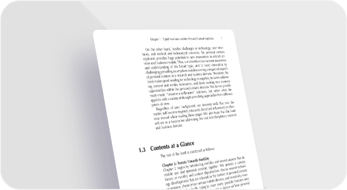 Chapter 1: Digital Memories and the Personal Content Explosion 7 On the other hand, besides challenges in technology, user inter- faces, and societal and behavioural concerns, the personal content explosion provides huge potential in new innovations in related ser- vices and business models. Thus, our intention is to increase awareness and understanding of this broad topic, and to boost innovation by challenging prevailing assumptions and discovering unexpected aspects of personal content as a research and business domain. Therefore, the book makes good reading for technology evangelists, lecturers address- ing content and media, innovators, and those seeking new business opportunities within the personal content domain. We do not provide ready-made “become-a-millionaire” solutions, but rather whet the appetite with a variety of thought-provoking approaches from different points of view. Regardless of your background, we sincerely wish that you, the reader, will become inspired, educated, disturbed, infl uenced, or other- wise moved when reading these pages. We also hope that this book will act as a booster for addressing this vast interdisciplinary research and business domain. 1.3 Contents at a Glance The rest of the book is structured as follows: Chapter 2: Trends Towards Mobility Chapter 2 begins by introducing mobility and several aspects that tie mobile use and personal content together. We present a concise history of mobility and content digitalization, discuss several technol- ogy developments that are relevant in the context of personal content experience, characterize various mobile devices, and reveal why man- ufacturers are frantically trying to cram every possible function into your watch. Together, these trends paint a picture of how personal devices will evolve in the mobile years to come. Chapter 3: Mobile Personal Content Uncovered Chapter 3 focuses on personal content and its inherent characteristics. We defi ne the term personal content, and provide methods for content categorization based on a number of factors. We analyse personal content from a number of viewpoints, and discuss the effects mobility has on the content. Finally, we present a high-level model for address- ing different user-level aspects of personal content management. We call this model “Get-Enjoy-Maintain-Share (GEMS)”, and show how it