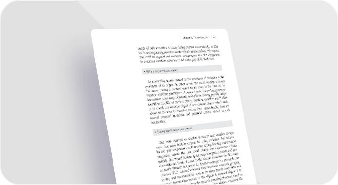 Chapter 8: Timeshifting Life 329 Loads of bulk metadata is today being created automatically, as RSS feeds accompanying new web content (such as photoblogs). We expect this trend to expand and continue, and propose that RSS integration to metadata creation schemes could easily pay off in the future. • RSS is a major metadata source An interesting notion related to the smartness of metadata is the awareness of its origins. In other words, we could develop schemes that allow tracing a content object to its roots in the case of, for instance, multiple generations of copies. A potential yet largely unstud- ied enabler is the usage of genetic coding for producing globally unique identifi ers (GUID) for content objects. Such an identifi er would allow us to check the ancestor object of any content object, which again allows us to check its ancestor, and so forth. Undoubtedly, there are several unsolved questions and potential threats related to such traceability. • Tracing objects back to their “roots” One more example of enablers is smarter user interface compo- nents that have built-in support for using metadata. For instance, list and grid components could provide sorting, fi ltering, and grouping properties, where the user could change the organization criteria quickly. This would facilitate quick ways to organize content and gen- erate different kinds of views to the content mass (see the discussion on Matrix Browser in Chapter 6). Another example is a zoomable user interface (ZUI), where the widest zoom level uses automatic grouping, sorting, and summarization, and as the users zooms closer, new and relevant information related to the objects is revealed (Figure 8-1). Furthermore, metadata enables dynamic browsing of content based on associations and relations between the content objects, instead of fi le- folder hierarchies. • Smarter UIs have metadata functionality built in 8.2 Metadata Creation: Top-Down or Bottom-Up? On a higher level, two approaches to smart metadata can be identifi ed. Either the top-down approach dominates, where metadata is included