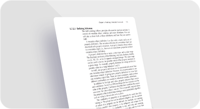 Chapter 5: Realizing a Metadata Framework 175 5.7.2.1 Defi ning Schemas The MdE ontology follows principles discussed in previous sections. It consists of metadata object, relation, and event defi nitions. Now we will take a closer look at these defi nitions and how they are used in MdE. A metadata object defi nition is a class with a name and a set of property defi nitions. The metadata attributes of a metadata object are described with property instances. A property instance always relates to a metadata object, i.e., there are no stand-alone properties without metadata object defi nition. A property defi nition has a name, a data type, and a value range. The data type can be any of the following: text, time, Boolean, double, or a 8-, 16-, 32-, or 64-bit signed or unsigned integer. The value range can be used to restrict the possible values of the property instances to a given range. For example, property defi nition for rating can limit its possible values to a range between 1 and 5. In MdE, one property defi nition can be associated with more than one metadata object defi nition. However, it is recommended to use inheritance instead of giving same property defi nitions to more than one metadata object class. There are some exceptions, such as when different cardinalities are needed in inherited metadata defi nitions. In addition to the type and value, property instances have source and confi dence. Source is a URI describing who has created or set the value of the property. Confi dence describes how confi dent the source was about the value when it was set. This is especially required when the property is the result of data mining or some probabilistic algorithm such as trying to detect who is in a photo. The cardinality of properties is set separately for each class they belong to. The properties can be defi ned obligatory; also the number of values of a property can be defi ned. For example, our ontology defi nes creation date property to be obligatory and unique for all content objects, i.e., its cardinality is one, and only one meaning, therefore every object must have a creation date and no more than one creation date. The cardinality can also be defi ned optional and infi nite so that the object may have several different values for the same property, or even no value. This is useful in instances of MP3 objects, where some may have several artists and others none. Note that when schema objects inherit properties from other objects, also property defi nitions are inherited as they stand. There is no way of changing defi nitions or even the cardinality. However, since the cardinality of the property is set separately to each metadata object defi nition, it means that it is possi- ble to defi ne one property defi nition that is optional for some metadata object defi nitions but compulsory in some other defi nition.