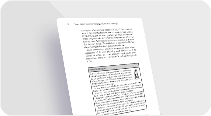 26 Personal Content Experience: Managing Digital Life in the Mobile Age 14 counterparts, otherwise their mobility will suffer. This means that some of their essential functions need to be compromised. Displays are smaller, keypads are tinier, processors are slower, and memories smaller compared to the devices found in living rooms and offi ces. This does not mean that mobile devices are always doomed to be worse than stationary devices. There will always be tradeoffs of mobile ben- efi ts versus mobile limitations, given the intended use. Power consumption is a key factor for any mobile device. Modern applications call for more processing speed, which comes at the expense of battery life. Faster electronics equals greater power consumption – unless the circuits can also be made signifi cantly smaller in size. POWER TO THE PEOPLE Cathy is a self-confessed power junkie. She routinely forgets to bring her mobile phone charger with her on the road. Even a little visit to the City gives her some headache, as she needs to fi nd a place to recharge. She’s got a ton of friends in the Greater London area, though, so there’s always a place to wind up. Besides, that gives a convenient excuse to meet people. So there she was again, at Paddington station with only one bar left of the battery. Cathy had talked to Deena in the train very briefl y – maybe just an hour – so why was it out of juice already? Steve had explained that with poor reception, like in a train, the battery would die more quickly. Ah, whatever. Cathy called some friends. Out of luck – Michelle was in Provence, Suzie busy in a session, and Denise could not be reached. What to do now? Switch off the phone? That was such an alien idea. Instead, Cathy decided to bite the bullet, follow Steve’s advice, and get an extra battery for her phone. There was a Phoney store a block away. Cathy walked in, explained her problem, and was out in fi ve minutes with a new battery, complete with new juice. That should make it. Now she would only have to make sure she remem- bered to bring the second battery with her on the road . . . The miniaturization of electronics in the past decades has allowed constantly increasing effi ciency in terms of computing cycles per watts consumed, and this trend will continue. Improved battery technologies have also allowed higher energy storage densities. However, at the same time, mobile gadgets have got bigger and brighter displays, and mobile applications have become larger in terms of their memory 14 Again, less so in the case of car electronics. Despite being mobile, vehicles can carry devices of substantial weight and size. In this book, the notion of “mobile” focuses on devices that we carry personally.