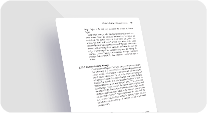 Chapter 5: Realizing a Metadata Framework 189 Script Engine is the only way to access the contexts in Context Engine. Using scripts is simple, all scripts having one condition and one or more actions. When the condition becomes true, the actions are carried out. The current version of Script Engine can perform two actions, “set atom” and “notify”. The set atom action creates a new context object that is put onto the blackboard. The notify action creates an event with a message that is sent to the application that owns the script. It is the duty of the application to process the message. For example, Context Engine’s Communications Manager understands messages that are SMS URLs. One script may contain both types of actions. 5.7.5.3 Communications Manager Communication Manager (CM) is the component in Context Engine that is in charge of all communications with external applications and context sources. It is analogous to harvesters and composers in the overall metadata framework. CM can receive requests for reading and writing context objects from external sources using Context Exchange Protocol. For example, if an external application needs to know the location of the user, it can send the query using CEP to Communica- tions Manager. CM fi rst checks if the external party has rights to read the data and if it is allowed, reads the location context object from the blackboard and fi nally sends it back to the requester. External parties can also send scripts to CE. Whenever this kind of script is fi red, that is, it becomes true, the CM is notifi ed by the Script Engine. It is then up to Communications Manager to notify the external party if consid- ered necessary. 5.8 Facing Real Life As a system component, the framework incurs a performance penalty to all applications using it. Since it is intended to manage all content in the mobile device, almost all applications are affected. Obviously, the applications that manage large amounts of content, such as image galleries, phonebooks, and music players, are heavily affected. Unfor- tunately, those are also among the most used applications for many mobile device owners. What follows is that the framework must be implemented carefully so that it performs optimally, by making com- promises where they are needed yet still providing the best possible service.