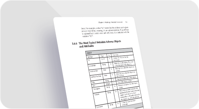 Chapter 5: Realizing a Metadata Framework 163 times. For example, a value “0+” means that the attribute can be given zero or more times, meaning it is an optional attribute. If an attribute is optional but it exists once and only once, it is indicated with the notation “0,1”. 5.6.6 The Most Typical Metadata Schema Objects and Attributes OBJECT Attribute Type N Comment ID UUID 1 Unique ID. Provided by the framework. accessPath String 1+ Path (URL) to the object. This is not a fi eld but part of the object id. creationDate Date 1 Date and time when the object was created. lastModifi edDate Date 0,1 Date and time when the object was last modifi ed. Title String 1 Human-readable title of the object. Size Integer 1 Size of the object in bytes. Description String 0+ Freetext description from the object creator. Freetext String 0+ This is not an actual metadata fi eld but handled by the freetext indexing engine. Each object may have freetext that is effi ciently indexed by the engine, e.g., effi cient retrieval Comment String 0+ A fi eld for some free-form comments. CONTENT OBJECT Attribute Type N Comment Rating Integer 0,1 User-given quality rating of the content object. Counter Integer 0,1 Rendering count of the object. Genre String 0+ Genre of the object. Drm Boolean 0,1 Flag to indicate protected content. releaseDate Date 0,1 The date when the content was released to public. mediaFormat String 0,1 RFC 2046 media type.
