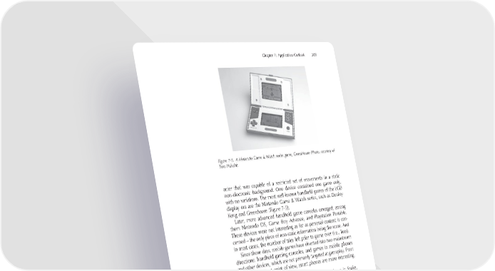 Chapter 7: Application Outlook 309 Figure 7-5. A Nintendo Game & Watch series game, GreenHouse (Photo: courtesy of Tero Hakala). acter that was capable of a restricted set of movements in a static non-electronic background. One device contained one game only, with no variations. The most well-known handheld games of the LCD display era are the Nintendo Game & Watch series, such as Donkey Kong and Greenhouse (Figure 7-5). Later, more advanced handheld game consoles emerged, among them Nintendo DS, Game Boy Advance, and Playstation Portable. These devices were not interesting as far as personal content is con- cerned – the only piece of non-static information being the score. And in most cases, the number of tries left prior to game over (i.e., lives). Since those days, mobile games have diverted into two mainstream directions: handheld gaming consoles, and games in mobile phones and other devices, which are not primarily targeted at gameplay. From a personal content point of view, smart phones are more interesting, since they allow many GEMS actions. Unarguably the best-known game in a mobile phone is Snake, introduced fi rst in the Nokia 5110 in 1997 (Figure 7-6). It is a typical example of a mobile game that has no specifi c mobile elements. Most mobile games of the Snake era are low-tech and usually played for a few minutes at a time when on the move. Such games are also referred to as casual games, and are considered the most important form of mobile games at the time of writing (Hyman 2005). Casual games can be challenging, but easy to access and quick to learn. Mobile games that exploit the features of a mobile phone – connectivity, communications, and context, for instance – are so far