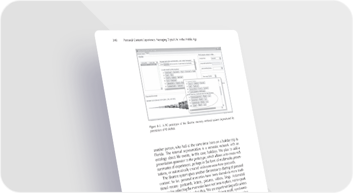 340 Personal Content Experience: Managing Digital Life in the Mobile Age Figure 8-3. A PC prototype of the Sharme memory retrieval system (reproduced by permission of © Nokia). another person, who had at the same time been on a holiday trip in Florida. The internal representation is a semantic network with an ontology about life events, in this case, holidays. We plan to add a presentation generator to the prototype, which allows us to create rich summaries of experiences, perhaps in the form of multimedia presen- tations, or automatically created wish-you-were-here postcards. The Sharme system gives another dimension to sharing of personal content. So far, personal memories have been shared via more tradi- tional means: postcards, letters, pictures, videos, blogs. Automated means for collecting the memories have not been in place, not to speak of organizing and sharing that data. We are experimenting with various options of organizing personal life data for effi cient recall, synchroniz- ing, backups, and other GEMS actions. Memory prosthesis makes it possible to treat our life data as just another kind of personal content. There are obvious concerns with such life sharing. Who will have access to my lifebase? What am I willing to share? What will I not share? What will I really like to remember, and what should rather be forgotten? How to fi nd the important bits? Is it really worth trying to keep everything? How could we summarize life events? And so on. All these questions are being debated on various fronts, and the personal content boom makes these questions ever more timely.