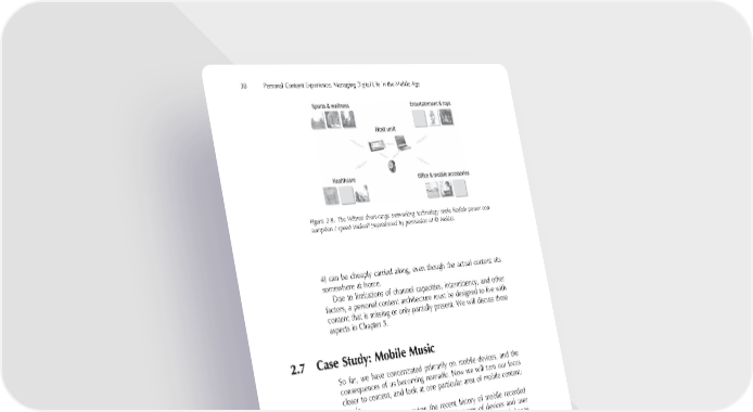 38 Personal Content Experience: Managing Digital Life in the Mobile Age Figure 2-9. The Wibree short-range networking technology seeks fl exible power con- sumption / speed tradeoff (reproduced by permission of © Nokia). 4) can be cheaply carried along, even though the actual content sits somewhere at home. Due to limitations of channel capacities, intermittency, and other factors, a personal content architecture must be designed to live with content that is missing or only partially present. We will discuss these aspects in Chapter 5. 2.7 Case Study: Mobile Music So far, we have concentrated primarily on mobile devices, and the consequences of us becoming nomadic. Now we will turn our focus closer to content, and look at one particular area of mobile content: music. In this section, we review the recent history of mobile recorded music and discuss how it has evolved in terms of devices and user control over the content. This area is now undergoing a rapid change from physical to digital artefacts, and therefore serves us well to illus- trate the kinds of developments that will follow in many other areas of mobile content. Use patterns related to mobile music are discussed in more detail in section 6.2. Ever since the birth of gramophones in the 19th century, music lis- teners have been able to take their favourite music on the road. Por- table record players usually offered inferior quality compared to those installed at home, but what mattered to people was the portability. They could enjoy the music at friends’, at parties, on the beach, or any