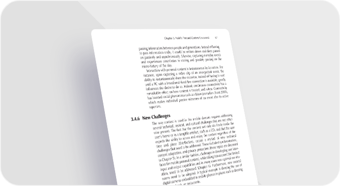 Chapter 3: Mobile Personal Content Uncovered 67 passing information between people and generations. Instead of having to pass information orally, it could be written down and then passed on passively and asynchronously. Likewise, capturing everyday events and experiences contributes to storing and possibly passing on the micro-history of the day. Interaction with personal content is instantaneous by its nature. For instance, upon capturing a video clip of an unexpected event, the ability to instantaneously share the occasion, instead of having to wait until a PC with a broadband fi xed line connection is available, greatly infl uences the desire to do so. Indeed, continuous connectivity has a remarkable effect on how content is treated, and when. Connectivity has boosted social phenomena such as citizen journalism (Scott 2005), which makes individual passive witnesses of an event also its active reporters. 3.4.6 New Challenges The way content is used in the mobile domain requires addressing several technical, societal, and cultural challenges that are not other- wise present. The fact that the content not only sits fi rmly inside the user’s home or in a tangible artefact, such as a CD, and that the user expects the ability to access and enjoy the content regardless of the time and place (distribution), causes a myriad of new technical challenges that need to be addressed. These included synchronization, content adaptation, and privacy protection (these topics are discussed in Chapter 5). In a similar fashion, challenges in developing user inter- faces for mobile personal content, while taking into account the limited input and output capabilities and in many cases non-optimal use situ- ation, need to be addressed (Chapter 6). Furthermore, new societal norms need to be adopted. A typical example is denying the use of digital cameras embedded in mobile phones in places such as dressing rooms, schools, or restaurants. 3.5 Content Wants to be Free? The Net interprets censorship as damage, and routes around it. John Gilmore, Electronic Frontier Foundation The often cited quote above could be easily extended to any system allowing content creation and sharing, by replacing the word “censor- ship” with “copyright protection”. Not surprisingly, then, Digital Rights Management (DRM), is an increasingly hot issue that concerns personal content directly. It is a matter of determining who can enjoy and
