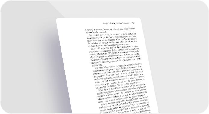 Chapter 5: Realizing a Metadata Framework 193 is no need to make another one unless there is some special metadata that needs to be harvested. Once the harvester is ready, the metadata it creates is available for all applications, not just for Faye’s. Those programmers who know Faye’s namespace and the semantics of her metadata can use all of the metadata her harvester creates, while others can still use those attributes that were already defi ned in the music schema. Faye’s MP3 application also has playlist management functions; thus, it needs metadata about playlists. Similarly to MP3 metadata, she creates a schema object MP3_playlist by extending an existing playlist object. She gives it one new Boolean property defi nition, random play. The property defi nition she creates dictates that the property can exist only once for any MP3_playlist, and if it exists, is must have a single Boolean value. Faye states in her metadata namespace documentation that if the value of random play property is true, then the playlist must be played in random order, while if the value is false or non-existing, the songs are played in a linear order. Now if a user of her application creates playlist, the application creates an instance of an MP3 playlist schema object. One such instance may have a URI playlist://favor- ites with a title property (derived from the parent defi nition of MP3_playlist) “My Greatest Hits” and random play set to true. When the end-user of Faye’s application will add songs into the playlists, the application will create a new contains relationship between the playlist and the song. Once the application has created a contains relationship from the playlist to the song, the MdE will automatically create a new is part of relationships from the songs to the playlist. Perhaps one of the songs will be downloaded from some Internet music store and has been protected by DRM. Therefore, its metadata instance also has a DRM fl ag property set to true. For these situations, Faye programs her music application to add requires – relationship from the song to the DRM certifi cate it needs. And again the MdE automatically creates relationship is required by from the DRM object to song. Faye can now make her application show immediately if some MP3 song cannot be played since it misses the DRM certifi cate. When Faye runs her MP3 player, it quickly obtains a list all MP3 songs in the device, since it simply requests all metadata objects that are an instance of the MP3 schema. For MdE, it is a simple database query. The application automatically obtains all MP3 songs stored in her media server, since the metadata about them is also stored in the device. The application can also display all basic information about them quickly, since the metadata is immediately available and there is no need to read binary fi les.