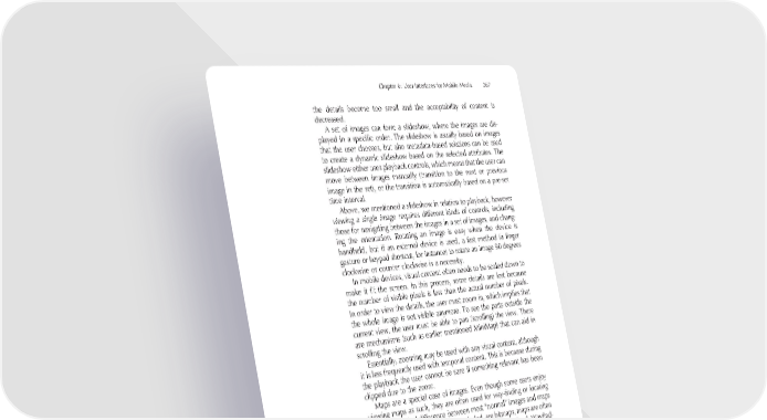 Chapter 6: User Interfaces for Mobile Media 267 the details become too small and the acceptability of content is decreased. A set of images can form a slideshow, where the images are dis- played in a specifi c order. The slideshow is usually based on images that the user chooses, but also metadata-based relations can be used to create a dynamic slideshow based on the selected attributes. The slideshow either uses playback controls, which means that the user can move between images manually (transition to the next or previous image in the set), or the transition is automatically based on a pre-set time interval. Above, we mentioned a slideshow in relation to playback, however viewing a single image requires different kinds of controls, including those for navigating between the images in a set of images, and chang- ing the orientation. Rotating an image is easy when the device is handheld, but if an external device is used, a fast method (a fi nger gesture or keypad shortcut, for instance) to rotate an image 90 degrees clockwise or counter clockwise is a necessity. In mobile devices, visual content often needs to be scaled down to make it fi t the screen. In this process, some details are lost because the number of visible pixels is less than the actual number of pixels. In order to view the details, the user must zoom in, which implies that the whole image is not visible anymore. To see the parts outside the current view, the user must be able to pan (scrolling) the view. There are mechanisms (such as earlier mentioned MiniMap) that can aid in scrolling the view. Essentially, zooming may be used with any visual content, although it is less frequently used with temporal content. This is because during the playback the user cannot be sure if something relevant has been clipped due to the zoom. Maps are a special case of images. Even though some users enjoy viewing maps as such, they are often used for way-fi nding or locating tasks. A technical difference between most “normal” images and maps is that while most images, photos included, are bitmaps, maps are often vector graphics that enable a smooth change of zoom level. Wayfi nd- ing requires the user to enter the start and end points (sometimes also other waypoints) for the route, which is then automatically calculated. The waypoints are pre-defi ned points of interest, selected locations on the map, or addresses. Furthermore, the preferred route is usually weighted based on points of interest, scenery, distance, or travel time. It is straightforward to overlay the route on a map image, which makes it easy to see the progress as well as anticipate events and places ahead. It is benefi cial to change the zoom level to see either more details of environment, or a wider overview. Especially in car