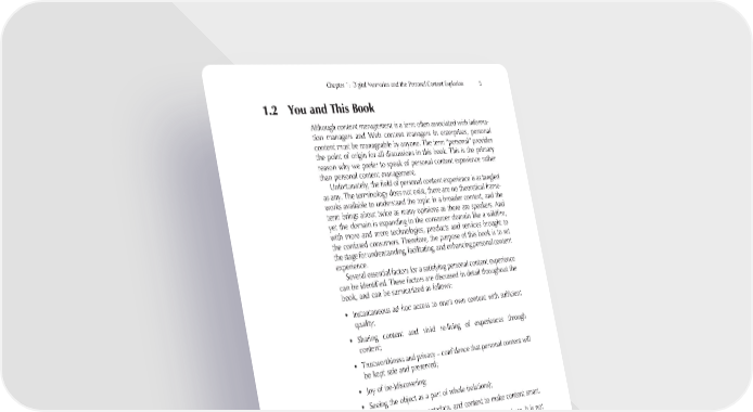 Chapter 1: Digital Memories and the Personal Content Explosion 5 1.2 You and This Book Although content management is a term often associated with informa- tion managers and Web content managers in enterprises, personal content must be manageable by anyone. The term “personal” provides the point of origin for all discussions in this book. This is the primary reason why we prefer to speak of personal content experience rather than personal content management. Unfortunately, the fi eld of personal content experience is as tangled as any. The terminology does not exist, there are no theoretical frame- works available to understand the topic in a broader context, and the term brings about twice as many opinions as there are speakers. And yet the domain is expanding in the consumer domain like a wildfi re, with more and more technologies, products and services brought to the confused consumers. Therefore, the purpose of this book is to set the stage for understanding, facilitating, and enhancing personal content experience. Several essential factors for a satisfying personal content experience can be identifi ed. These factors are discussed in detail throughout the book, and can be summarized as follows: • Instantaneous ad hoc access to one’s own content with suffi cient quality; • Sharing content and vivid re-living of experiences through content; • Trustworthiness and privacy – confi dence that personal content will be kept safe and preserved; • Joy of (re-)discovering; • Seeing the object as a part of whole (relations); • Exploiting mobility, metadata, and context to make content smart. The above list is just the tip of the personal content iceberg. It is not only individual users or user groups and their experiences and behav- iour that we will discuss; and it is not only the essential technologies that we will show are needed to put all the bits and pieces together. We will also address many societal issues, such as social acceptability and privacy; copyright and liability laws; issues related to mass media and media (re)production; new distribution paradigms, such as viral marketing and super-distribution; new or enhanced business opportu- nities, such as online services for content analysis, processing, and fi l- tering; and so on. Because personal content is inherently tied to many