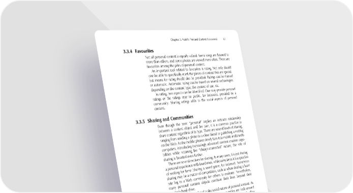 Chapter 3: Mobile Personal Content Uncovered 61 3.3.4 Favourites Not all personal content is equally valued. Some songs are listened to more than others, and some photos are viewed more often. There are favourites among the piles of personal content. An important tool related to favourites is rating. Not only should one be able to specifi cally mark the pieces of content that are special, but means for rating should also be provided. Ratings can be manual or automatic. Automatic rating can be based on several technologies, depending on the content type, the context of use, etc. In rating, two aspects can be identifi ed. One may provide personal ratings or the ratings may be public, for instances, provided by a community. Sharing ratings adds to the social aspects of personal content. 3.3.5 Sharing and Communities Even though the term “personal” implies an intimate relationship between a content object and the user, it is a common practice to share content regardless of its type. There are several levels of sharing, ranging from sending a photo to a close friend to publishing a moblog on the Web. As the mobile phones slowly turn into mobile multimedia computers, introducing increasingly advanced content creation capa- bilities while retaining the “always-connected” nature, the role of sharing is boosted even further. There are several motives for sharing. In many cases, it is just sharing a personal experience with loved ones, while sometimes it is a question of seeking for fame (sharing a saved game, for instance). Sometimes sharing may be a matter of competition, such as when sharing a heart rate log in a Web community for others to evaluate. Nevertheless, many personal content objects continue their lives beyond their creator’s hard drive. Sharing is tightly related to the social nature of personal content. As witnessed in section 7.3, many online communities are built around sharing content in different forms. Such communities routinely allow uploading one’s own content and linking it with other people and content objects, as well as downloading, commenting, and rating other users’ content. 3.3.6 Relations and Associations It is uncommon for a piece of personal content to appear in a void, without relating to any other piece of personal content. Many photos are related to other photos, taken on the same occasion; most songs