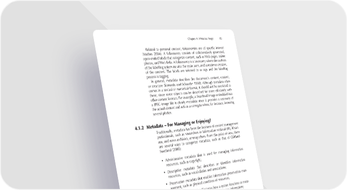 Chapter 4: Metadata Magic 83 Related to personal content, folksonomies are of specifi c interest (Mathes 2004). A folksonomy consists of collaboratively generated, open-ended labels that categorize content, such as Web pages, online photos, and Web links. A folksonomy is a taxonomy where the authors of the labelling system are also the main users, and sometimes creators, of the content. The labels are referred to as tags and the labelling process is tagging. In general, metadata describes the document’s content, context, or structure (Kennedy and Schauder 1998). Although metadata often comes in a textual or numerical format, it should not be restricted to these, since some objects can be described far more effi ciently with other content formats. For example, a thumbnail image embedded into a JPEG image fi le is clearly metadata since it provides a summary of the actual content and acts as a surrogate when, for instance, browsing several photos. 4.1.2 Metadata – For Managing or Enjoying? Traditionally, metadata has been the business of content management professionals, such as researchers in information retrieval (IR), librari- ans, and news archivists, among others. From this point of view, there are several ways to categorize metadata, such as that of Gilliland- Swetland (2000): • Administrative metadata that is used for managing information resources, such as copyright; • Descriptive metadata that describes or identifi es information resources, such as vocabularies and annotations; • Preservation metadata that enables information preservation man- agement, such as physical condition of resources; • Technical metadata that illustrates how a system functions or meta- data behaves, such as formats and compression information; • Use metadata that describes level and type of information use, such as user tracking. The above list is typical of the professional content management view- point: analytic, technical, neutral, functional. However, iPod-toting youngsters are not interested in the metadata in their players, as long as it does the magic and helps them to fi nd the “good stuff”. They might choose altogether different categories for metadata, such as the following for describing music: