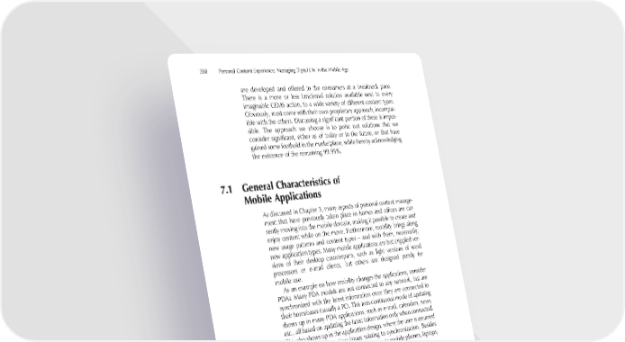288 Personal Content Experience: Managing Digital Life in the Mobile Age are developed and offered to the consumers at a breakneck pace. There is a more or less functional solution available next to every imaginable GEMS action, to a wide variety of different content types. Obviously, most come with their own proprietary approach, incompat- ible with the others. Discussing a signifi cant portion of these is impos- sible. The approach we choose is to point out solutions that we consider signifi cant, either as of today or in the future, or that have gained some foothold in the marketplace, while hereby acknowledging the existence of the remaining 99.99%. 7.1 General Characteristics of Mobile Applications As discussed in Chapter 3, many aspects of personal content manage- ment that have previously taken place in homes and offi ces are cur- rently moving into the mobile domain, making it possible to create and enjoy content while on the move. Furthermore, mobility brings along new usage patterns and content types – and with them, necessarily, new application types. Many mobile applications are but crippled ver- sions of their desktop counterparts, such as light versions of word processors or e-mail clients, but others are designed purely for mobile use. As an example on how mobility changes the applications, consider PDAs. Many PDA models are not connected to any network, but are synchronized with the latest information once they are connected to their homebases (usually a PC). This non-continuous mode of updating shows up in many PDA applications, such as e-mail, calendars, news, etc., all based on updating the latest information only when connected. This also shows up in the application design, where the user is assumed to be aware of the various issues relating to synchronization. Besides PDAs, the same model applies, for instance, to mobile phones, laptops, and MP3 players. Consumer software sales for desktop computers are an everyday business, with games and standard offi ce applications usually ranking highest in top selling lists. On the contrary, the market for software for mobile devices has been far more limited, not least due to the many proprietary closed systems that do not support third-party applica- tions. A direct consequence is that most users settle for the software provided with the mobile device and never bother to buy additional applications. With the increasing availability of open mobile platforms,