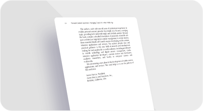 xiv Personal Content Experience: Managing Digital Life in the Mobile Age The authors, each with several years of professional experience in mobile personal content, provide clear insight into this new, emerging topic, providing both industrial insight and scholarly analysis. Because the book contains a detailed description of proposed, extensible soft- ware architecture targeted at content management in mobile devices, these essential details will benefi t anyone developing mobile content- intensive applications and services. The authors provide clear and practical guidance to this new fi eld of research and development, making the book applicable to a wide audience, including practitioners in mobile technology and digital content management, media- intensive application developers, content creators and distributors, academic researchers, and faculty in computer science and multimedia. We are entering a new phase in the development of mobile content, applications, and services. This book helps us to see the patterns of this evolution. Aaron Marcus, President, Aaron Marcus and Associates, Inc., Berkeley, California, USA