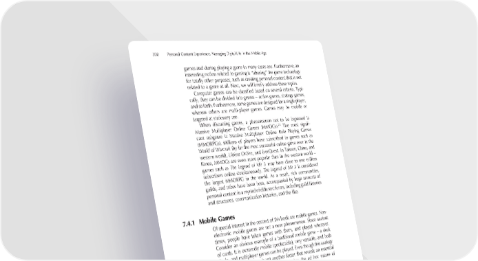 308 Personal Content Experience: Managing Digital Life in the Mobile Age games and during playing a game in many cases are. Furthermore, an interesting notion related to gaming is “abusing” the game technology for totally other purposes, such as creating personal content that is not related to a game at all. Next, we will briefl y address these topics. Computer games can be classifi ed based on several criteria. Typi- cally, they can be divided into genres – action games, strategy games, and so forth. Furthermore, some games are designed for a single player, whereas others are multi-player games. Games may be mobile or targeted at stationary use. When discussing games, a phenomenon not to be bypassed is 26 Massive Multiplayer Online Games (MMOGs). The most signifi - cant subgenre is Massive Multiplayer Online Role Playing Games (MMORPGs). Millions of players have subscribed to games such as World of Warcraft (by far the most successful online game ever in the western world), Ultima Online, and EverQuest. In Taiwan, China, and Korea, MMOGs are even more popular than in the western world – games such as The Legend of Mir 3 may have close to one million subscribers online simultaneously. The Legend of Mir 3 is considered the largest MMORPG in the world. As a result, rich communities, guilds, and tribes have been born, accompanied by huge amounts of personal content in a myriad of different forms, including guild histories and structures, communication histories, and the like. 7.4.1 Mobile Games Of special interest in the context of this book are mobile games. Non- electronic mobile games are not a new phenomenon. Since ancient times, people have taken games with them, and played wherever. Consider an obvious example of a traditional mobile game – a deck of cards. It is extremely mobile (pocketable), very versatile, and both single- and multiplayer games can be played. Even though this analogy may seem trivial, there is yet another factor that reveals an essential factor of mobile games, digital or otherwise: the ad hoc nature of gameplay. The fi rst electronic handheld gaming devices were equipped with LED displays, among them the Mattel Auto Race (1976). The player interacted with the game by pressing buttons to move their car (a bright dot) and to avoid obstacles (less bright dots). During the 1980s, LCD displays replaced LED displays in handheld games. However, the games were still extremely simple: the user controlled a digital char- 26 For a thorough analysis, see http://www.mmogchart.com/