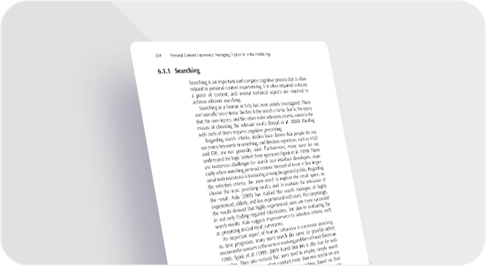 204 Personal Content Experience: Managing Digital Life in the Mobile Age 6.1.1 Searching Searching is an important and complex cognitive process that is often related to personal content experiencing. It is often required to locate a piece of content, and several technical aspects are required to achieve effi cient searching. Searching as a human activity has been widely investigated. There are basically two criteria: the fi rst is the search criteria, that is, the query that the user inputs; and the other is the selection criteria, which is the means of choosing the relevant results (Bental et al. 2000). Dealing with both of them requires cognitive processing. Regarding search criteria, studies have shown that people do not use many keywords in searching, and Boolean operators, such as AND and OR, are not generally used. Furthermore, many users do not understand the logic behind these operators (Spink et al. 1999). There are numerous challenges for search user interface developers, espe- cially when searching personal content (instead of more or less imper- sonal web resources) is increasing among the general public. Regarding the selection criteria, the users need to explore the result space, to choose the most promising results, and to evaluate the relevance of the result. Aula (2005) has studied the search strategies of highly experienced, elderly, and less experienced web users. Not surprisingly, the results showed that highly experienced users are more successful in not only fi nding required information, but also in evaluating the search results. Aula suggests improvements to selection criteria, such as presenting textual result summaries. An important aspect of human behaviour is successive searching. As time progresses, many users search the same (or possibly other) resources for answers to the same or evolving problem at hand (Bateman 1998). Spink et al. (1999; 2001) found that this is also true for web searches. They also noticed that users tend to employ simple search strategies, and that they often conduct more than one search on any one topic, that is, they employ successive searching. Based on their analysis, they suggest that web search engines should provide a way of saving users searches for future use, in order to better support suc- cessive searching. Since then, search history has been implemented in, for instance, Google’s search toolbar. The discussion above concerns searching in general, yet in many cases it is targeted at web searches that concern mostly non-personal content. However, searching for personal content is different com- pared to web searches, especially as the user is familiar with many characteristics of their content, including the context related to it (Cutrell et al. 2006).