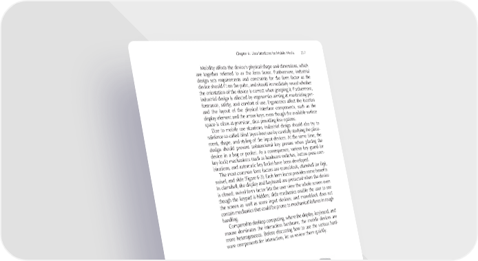 Chapter 6: User Interfaces for Mobile Media 217 Mobility affects the device’s physical shape and dimensions, which are together referred to as the form factor. Furthermore, industrial design sets requirements and constraints for the form factor as the device should fi t on the palm, and should immediately reveal whether the orientation of the device is correct when grasping it. Furthermore, industrial design is affected by ergonomics aiming at maximizing per- formance, safety, and comfort of use. Ergonomics affect the location and the layout of the physical interface components, such as the display element and the arrow keys, even though the available surface space is often at premium, thus providing few options. Due to mobile use situations, industrial design should also try to reinforce so-called blind (eyes-free) use by carefully studying the place- ment, shape, and styling of the input devices. At the same time, the design should prevent unintentional key presses when placing the device in a bag or pocket. As a consequence, various key guard (or key lock) mechanisms (such as hardware switches, button press com- binations, and automatic key locks) have been developed. The most common form factors are monoblock, clamshell (or fl ip), swivel, and slide (Figure 6-3). Each form factor provides some benefi ts. In clamshell, the display and keyboard are protected when the device is closed; swivel form factor lets the user view the whole screen even though the keypad is hidden; slide mechanics enable the user to see the screen as well as some input devices; and monoblock does not contain mechanics that could be prone to mechanical failures in rough handling. Compared to desktop computing, where the display, keyboard, and mouse dominates the interaction hardware, the mobile devices are more heterogeneous. Before discussing how to use the various hard- ware components for interaction, let us review them quickly. Figure 6-3. Illustrations of mobile device form factors. From left to right: Monoblock, fl ip (clamshell), swivel, and slide.