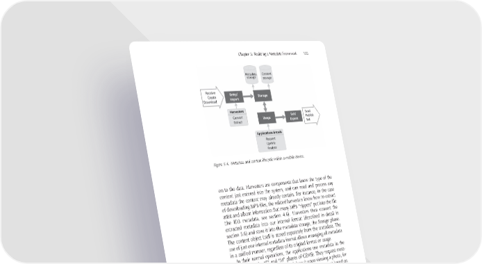Chapter 5: Realizing a Metadata Framework 155 Figure 5-4. Metadata and content lifecycle within a mobile device. on to the data. Harvesters are components that know the type of the content just entered into the system, and can read and process any metadata the content may already contain. For instance, in the case of downloading MP3 fi les, the related harvesters know how to extract artist and album information that many MP3 “rippers” put into the fi le (the ID3 metadata, see section 4.6). Harvesters then convert the extracted metadata into our internal format (described in detail in section 5.6) and store it into the metadata storage, the Storage phase. The content object itself is stored separately from the metadata. The use of just one internal metadata format allows managing all metadata in a unifi ed manner, regardless of its original format or usage. In their normal operations, the applications use metadata in the Usage phase (the “E” and “M” phases of GEMS). They request meta- data from the metadata storage and show it upon viewing a photo, for instance. They may further search, group, and fi lter content based on metadata attributes to show, for example, only new songs, or videos shot at a certain location. In addition to metadata usage, applications also update the meta- data or create new metadata that is also stored. For instance, the play count of a song is increased whenever the song has been listened to, and a recipient is associated with a message upon sending it. Further- more, the content objects are constantly analyzed by an array of soft- ware components to identify associations between them, and to recognize objects in a photo, for example.