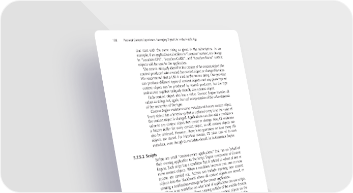 188 Personal Content Experience: Managing Digital Life in the Mobile Age that start with the same string as given in the subscription. As an example, if an application subscribes to “Location” context, any change in “Location:GPS”, “Location:CellID”, and “Location:Name” context objects will be sent to the application. The source uniquely identifi es the creator of the context object (the context producer) who created the context object or changed its value. We recommend that a URI is used as the source string. One provider can produce different types of context objects and any given type of context object can be produced by several producers, but the type and source together uniquely identify any context object. Each context object also has a value. Context Engine handles all values as strings but, again, the real interpretation of the value depends of the semantics of the type. Context Engine maintains some metadata with every context object. Every object has a timestamp that is updated every time the value of the context object is changed. Applications can also add a confi dence value to any context object they create or change. Also, CE maintains a history buffer for every context object, so old context objects can also be retrieved. However, there is no guarantee on how many old objects are stored. For historical reasons, CE takes care of its own metadata, even though its metadata should be in Metadata Engine. 5.7.5.2 Scripts Scripts are small “context-aware applications” that run on behalf of their owning application in the Script Engine component of Context Engine. Each script has a condition that is related to values of one or more context objects. When a condition becomes true, one or more actions are carried out. Actions can include inserting new context objects into the blackboard where all context objects are stored, or sending a notifi cation message to the owner application. There is no restriction on what kind of applications can use scripts. To external applications (those running outside of the mobile device), the scripts are the only way to get access to context objects on the blackboard. Script Engine provides more complex subscription facility to applications than the blackboard. Scripts can be sent over the air in XML format by using facilities in Communications Manager. The script XML specifi cation is available at the MUPE homepage. Applications have a possibility to delegate subscriptions to context objects to Script Engine. If the purpose of an application is to create higher-level context objects, it might be easier to use the script engine rather than Context Engine directly. Of course, as discussed above, for those applications that run on a network outside of the mobile device,
