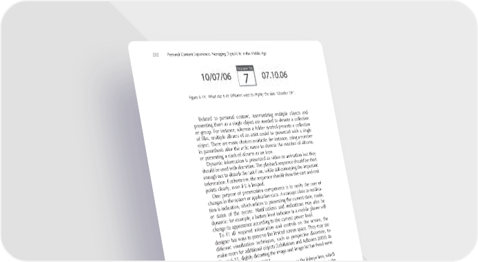 232 Personal Content Experience: Managing Digital Life in the Mobile Age Figure 6-14. What day is it? Different ways to display the date “October 7th”. Related to personal content, summarizing multiple objects and presenting them as a single object are needed to denote a collection or group. For instance, whereas a folder symbol presents a collection of fi les, multiple albums of an artist could be presented with a single object. There are many choices available: for instance, using a number in parenthesis after the artist name to denote the number of albums, or presenting a stack of albums as an icon. Dynamic information is presented as video or animation but they should be used with discretion. The playback sequence should be short enough not to disturb the task fl ow, while still conveying the important information. Furthermore, the sequence should show the start and end points clearly, even if it is looped. One purpose of presentation components is to notify the user of changes in the system or application state. A concept close to notifi ca- tion is indication, which relates to presenting the current state, mode, or status of the system. Notifi cations and indications may also be dynamic: for example, a battery level indicator in a mobile phone will change its appearance according to the current power level. To fi t all required information and controls on the screen, the designer has ways to preserve the limited screen space. They may use different visualization techniques, such as perspective distortion, to make room for additional objects (Lehikoinen and Aaltonen 2003). In Figure 6-15, slightly distorting the image and image list has freed some screen real estate for a menu. Another way to distort the view is known as the fi sheye lens, which enables seeing an important object in detail, while preserving the broader context in which the object belongs. An example of this technique is the rubber sheet view that is suitable for small displays (Sarkar et al. 1993). Figure 6-15 introduces a visualization technique that uses more than two dimensions and thus provides an illusion of depth, which exploits the user’s spatial memory. In the fi gure, a 2D tilted plane is fl oating in a 3D space. As a consequence, the interaction remains two- dimensional and can be performed with, for instance, a regular fi ve-way joystick (Hakala et al. 2005a; Drucker et al. 2004). Using true