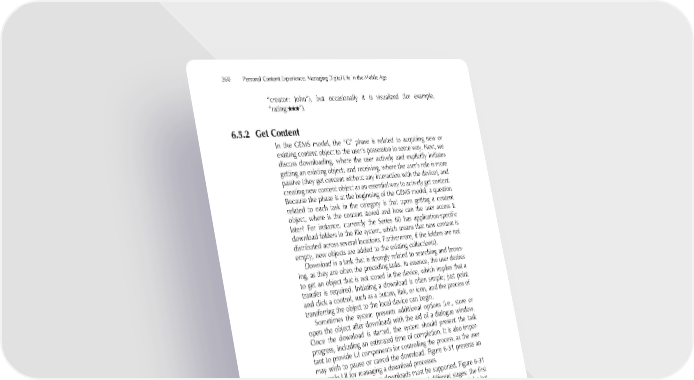 260 Personal Content Experience: Managing Digital Life in the Mobile Age “creator: John”), but occasionally it is visualized (for example, “rating: ”). 6.5.2 Get Content In the GEMS model, the “G” phase is related to acquiring new or existing content object to the user’s possession in some way. Next, we discuss downloading, where the user actively and explicitly initiates getting an existing object; and receiving, where the user’s role is more passive (they get content without any interaction with the device), and creating new content object as an essential way to actively get content. Because the phase is at the beginning of the GEMS model, a question related to each task in the category is that upon getting a content object, where is the content stored and how can the user access it later? For instance, currently the Series 60 has application-specifi c download folders in the fi le system, which means that new content is distributed across several locations. Furthermore, if the folders are not empty, new objects are added to the existing collection(s). Download is a task that is strongly related to searching and brows- ing, as they are often the preceding tasks. In essence, the user desires to get an object that is not stored in the device, which implies that a transfer is required. Initiating a download is often simple; just point and click a control, such as a button, link, or icon, and the process of transferring the object to the local device can begin. Sometimes the system presents additional options (i.e., store or open the object after download) with the aid of a dialogue window. Once the download is started, the system should present the task progress, including an estimated time of completion. It is also impor- tant to provide UI components for controlling the process, as the user may wish to pause or cancel the download. Figure 6-31 presents an example UI for managing a download processes. Multiple simultaneous downloads must be supported. Figure 6-31 shows a list consisting of four downloads at different stages; the fi rst one is completed, the second and the third are ongoing, and the last one is in a paused state. For each download, the list item shows the object name, format, size, colour-coded progress indicator for transfer, cost indicator, icon for the transfer channel, state of transfer, estimated amount of remaining data, and time. Furthermore, each item has controls for interacting with the item, their functionality depending on the item state. There are many technologies for downloading content. Typically, the technologies have a different effect on the cost and duration of the download process. Because users are dominantly cost-aware, it would
