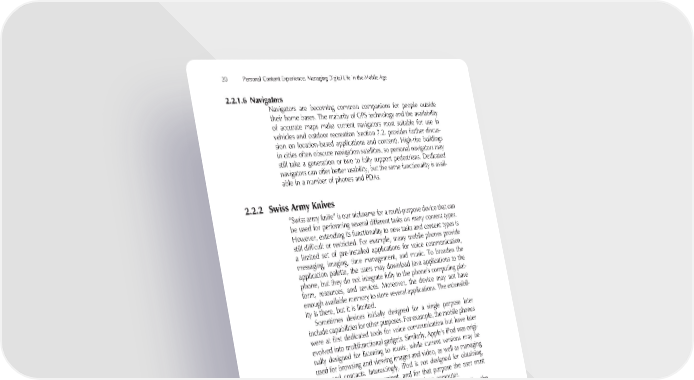 20 Personal Content Experience: Managing Digital Life in the Mobile Age 2.2.1.6 Navigators Navigators are becoming common companions for people outside their home bases. The maturity of GPS technology and the availability of accurate maps make current navigators most suitable for use in vehicles and outdoor recreation (section 7.2. provides further discus- sion on location-based applications and content). High-rise buildings in cities often obscure navigation satellites, so personal navigators may still take a generation or two to fully support pedestrians. Dedicated navigators can offer better usability, but the same functionality is avail- able in a number of phones and PDAs. 2.2.2 Swiss Army Knives “Swiss army knife” is our nickname for a multi-purpose device that can be used for performing several different tasks on many content types. However, extending its functionality to new tasks and content types is still diffi cult or restricted. For example, many mobile phones provide a limited set of pre-installed applications for voice communication, messaging, imaging, time management, and music. To broaden the application palette, the users may download Java applications to the phone, but they do not integrate fully to the phone’s computing plat- form, resources, and services. Moreover, the device may not have enough available memory to store several applications. The extensibil- ity is there, but it is limited. Sometimes devices initially designed for a single purpose later include capabilities for other purposes. For example, the mobile phones were at fi rst dedicated tools for voice communication but have later evolved into multifunctional gadgets. Similarly, Apple’s iPod was origi- nally designed for listening to music, while current versions may be used for browsing and viewing images and video, as well as managing time and contacts. Interestingly, iPod is not designed for obtaining, maintaining, or sharing content, and for that purpose the user must use the iTunes client application on a desktop computer. 7 Similarly, in handheld gaming consoles, Sony PSP is leading the evolution of this device class towards more feature-loaded devices. 8 When compared to arguably similar Nintendo DS, Sony PSP is closer to our Swiss army knife category, because it is designed also for brows- ing web, music, video, and images, whereas Nintendo DS is committed to gaming. 7 http://www.yourpsp.com/ 8 http://www.nintendo.com/systemsds