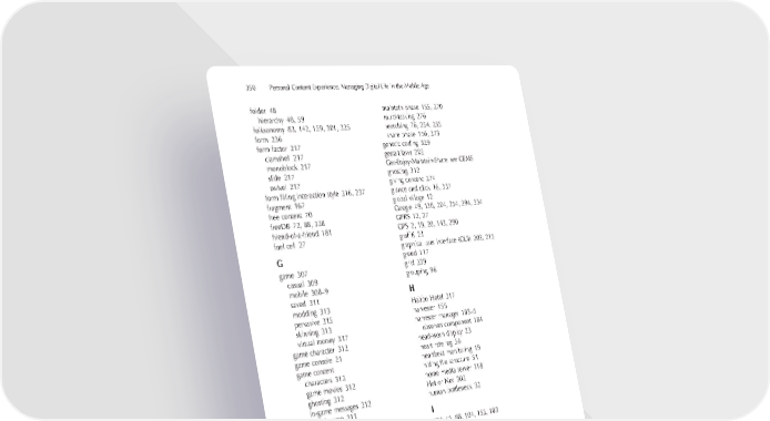 350 Personal Content Experience: Managing Digital Life in the Mobile Age folder 48 maintain phase 155, 270 hierarchy 48, 59 multi-tasking 276 folksonomy 83, 142, 159, 301, 325 searching 76, 254, 255 form 236 share phase 156, 273 form factor 217 genetic coding 329 clamshell 217 gestalt laws 202 monoblock 217 Get-Enjoy-Maintain-Share see GEMS slide 217 ghosting 312 swivel 217 giving content 274 form fi lling interaction style 216, 237 glance and click 16, 337 fragment 167 global village 12 free content 70 Google 49, 138, 204, 254, 294, 334 freeDB 72, 88, 328 GPRS 12, 27 friend-of-a-friend 181 GPS 2, 19, 20, 143, 290 fuel cell 27 graffi ti 23 G graphical user interface (GUI) 202, 215 greed 117 game 307 grid 239 casual 309 grouping 96 mobile 308–9 H saved 311 modding 313 Habbo Hotel 317 pervasive 315 harvester 155 skinning 313 harvester manager 183–5 virtual money 317 observer component 184 game character 312 head-worn display 23 game console 21 heart rate log 56 game content heartbeat monitoring 19 characters 312 hiding fi le structure 51 game movies 312 home media server 118 ghosting 312 Hot or Not 302 in-game messages 312 human bottleneck 32 saved game 311 I score 311 game item 312 ID3 41, 88, 104, 155, 183 game modding 313–14 ignorance 117 game or gaming console 21, 119 immediate usability 253 game walkthrough 312 incoming content 73 gaps in life 15, 213 inference 157 GEMS 7, 72–6 information appliance 17 browsing 76, 256, 257 Information Interchange Model (IIM) 104 effect of device category 277 information retrieval 83 effect on application development 286 input 201, 220–2 enjoy phase 155, 266 continuous 221 evolution 75 discrete 221 get phase 154, 260 human 202