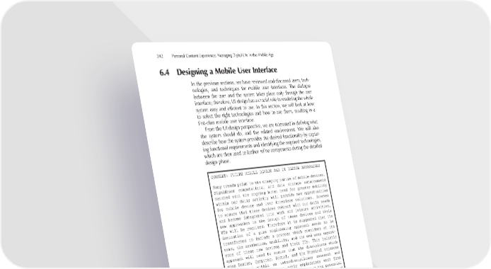 242 Personal Content Experience: Managing Digital Life in the Mobile Age 6.4 Designing a Mobile User Interface In the previous sections, we have reviewed and discussed users, tech- nologies, and techniques for mobile user interfaces. The dialogue between the user and the system takes place only through the user interface; therefore, UI design has a crucial role in rendering the whole system easy and effi cient to use. In this section, we will look at how to select the right technologies and how to use them, resulting in a fi rst-class mobile user interface. From the UI design perspective, we are interested in defi ning what the system should do, and the related environment. We will also describe how the system provides the desired functionality by captur- ing functional requirements and identifying the required technologies, which are then used to further refi ne components during the detailed design phase. COMMENT: FUTURE MOBILE DEVICE AND UI DESIGN APPROACHES Many trends point to the changing nature of mobile devices. Signifi cant computational and data storage enhancements matched with the ongoing human need for greater mobility within our daily activity will provide new opportunities for mobile device and user interface solutions. However to ensure that these devices connect with our daily needs and become integrated into work and leisure activities, new approaches to the design of these devices and their UIs will be required. Therefore it is suggested that the domination of a pure engineering approach needs to be transformed to include a process which considers at its core, the aesthetics, usability, and the end user experi- ence of these new devices and their UIs. This holistic approach will need to ensure that the disciplines which span Design, Computer, Social, and the Physical sciences are engaged within an interdisciplinary research and development activity. Some early exploratory work from various research groups have begun to show the potential of such an approach over traditional engineering dominated methods. As this work matures, a continual refl ection of the benefi ts of these new mobile devices should become part of the development cycle to ensure that the maximum benefi t and an enhanced user experience is achieved. Sam Bucolo Sam Bucolo is Research and Development Director in Australasian CRC for Interac- tion Design (ACID), and Associate Professor in Industrial Design, School of Design, QUT