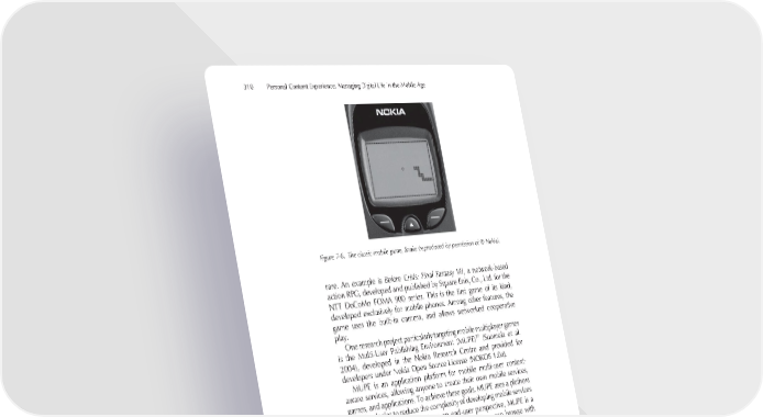 310 Personal Content Experience: Managing Digital Life in the Mobile Age Figure 7-6. The classic mobile game, Snake (reproduced by permission of © Nokia). rare. An example is Before Crisis: Final Fantasy VII, a network-based action RPG, developed and published by Square Enix, Co., Ltd. for the NTT DoCoMo FOMA 900 series. This is the fi rst game of its kind, developed exclusively for mobile phones. Among other features, the game uses the built-in camera, and allows networked cooperative play. One research project particularly targeting mobile multiplayer games 27 is the Multi-User Publishing Environment (MUPE) (Suomela et al. 2004), developed in the Nokia Research Centre and provided for developers under Nokia Open Source License (NOKOS 1.0a). MUPE is an application platform for mobile multi-user context- aware services, allowing anyone to create their own mobile services, games, and applications. To achieve these goals, MUPE uses a plethora of technologies to reduce the complexity of developing mobile services in client and server sides. From an end-user perspective, MUPE is a collection of services, and a service browser. Users can browse with MUPE client for new services, connect to them, and create persistent user accounts. After this, they can use many online services, such as games, messengers, and so forth. A single MUPE client installation is enough for all functionality, since once installed, MUPE updates itself as necessary. MUPE is used in two ways. The services are used by installing the MUPE client, and the services are hosted, and developed, by installing the back-end packages. 27 http://www.mupe.net/