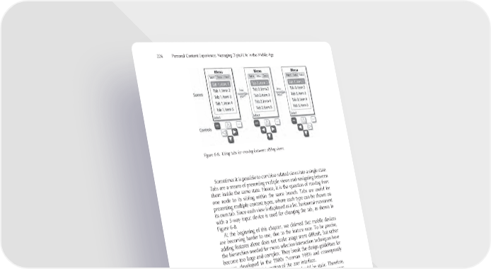 226 Personal Content Experience: Managing Digital Life in the Mobile Age Figure 6-8. Using tabs for moving between sibling views. Sometimes it is possible to combine related views into a single state. Tabs are a means of presenting multiple views and navigating between them inside the same state. Hence, it is the question of moving from one node to its sibling within the same branch. Tabs are useful for presenting multiple content types, where each type can be shown on its own tab. Since each view is displayed as a list, horizontal movement with a 5-way input device is used for changing the tab, as shown in Figure 6-8. At the beginning of this chapter, we claimed that mobile devices are becoming harder to use, due to the feature race. To be precise, adding features alone does not make usage more diffi cult, but rather the hierarchies needed for menu selection interaction techniques have become too large and complex. They break the design guidelines for menus, developed in the 1980s (Norman 1991) and consequently contribute to the disintegration of the user interface. To facilitate learning, the UI structure should be static. Therefore, if some states or sub-states are temporarily not available in the menus, they should not be removed but rather disabled (Figures 6-7 and 6-8). Altering the structure would hinder the navigation since the user may not understand why the location of some states is changed, and why some options are not visible. In addition to application views, the system frequently needs to alert, notify, present further options, or query input from the user. In order not to disturb the task fl ow by changing the view, the system makes use of pop-up dialogues, displayed on top of the application view (Figure 6-9). Since mobile user interfaces avoid window management,