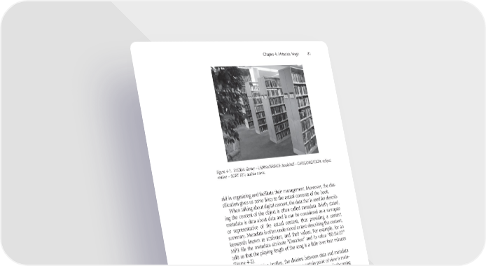 Chapter 4: Metadata Magic 81 Figure 4-1. SYSTEM: library – USER INTERFACE: bookshelf – CATEGORIZATION: subject matter – SORT KEY: author name. aid in organizing and facilitate their management. Moreover, the clas- sifi cation gives us some hints to the actual contents of the book. When talking about digital content, the data that is used for describ- ing the content of the object is often called metadata. Briefl y stated, metadata is data about data and it can be considered as a surrogate or representative of the actual content, thus providing a content summary. Metadata is often understood as text describing the content, keywords known as attributes, and their values. For example, for an MP3 fi le the metadata attribute “Duration” and its value “00:04:07” tells us that the playing length of the song is a little over four minutes (Figure 4-2). As the defi nition implies, the division between data and metadata is not unambiguous. What is data from a certain point of view is meta- data from another. For example, a Web service that lists forthcoming TV programmes treats the starting and ending times of the individual programmes as metadata. However, when that schedule is loaded to a PVR for automated recording, the same piece of information becomes input data to the recorder. Similarly, the “Call log” application in the mobile phone stores the communication history (dialed, received and missed calls, and the associated timestamps). The “Phonebook” appli- cation may then use this information as a descriptor for a contact. Therefore, the communication information is data for the “Call log”, and metadata for the “Phonebook”.