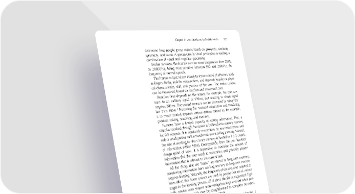 Chapter 6: User Interfaces for Mobile Media 203 determine how people group objects based on proximity, similarity, symmetry, and so on. A special case in visual perception is reading, a combination of visual and cognitive processing. Similar to vision, the human ear can sense frequencies from 20 Hz to 20 000 Hz, being most sensitive between 500 and 2000 Hz, the frequency of normal speech. The human output relates mainly to motor control of effectors, such as fi ngers, limbs, and the vocal system, and depends heavily on physi- cal characteristics, skill, and practice of the user. The motor control can be measured, based on reaction and movement time. Reaction time depends on the senses. For example, the user can react to an auditory signal in 150 ms, but reacting to visual signal requires 200 ms. The second measure can be estimated by using Fitts’ 1 law (Fitts 1954). Processing the received information and translating it to motor control requires various actions related to, for example, problem solving, reasoning, and memory. Humans have a limited capacity of storing information. First, a stimulus received through the senses is buffered into sensory memory for 0.5 seconds. It is constantly overwritten by new information and only a small portion of it is transferred into working memory. Second, the size of working (or short-term) memory is limited to 7 ± 2 chunks of information (Miller 1956). Consequently, from the user interface design point of view, it is imperative to minimize the amount of information that the user needs to remember, and primarily present information that is relevant to the current task. All the things that we “know” are stored in long-term memory; transferring information from working memory to long-term memory requires learning. Naturally, the frequency of use and time required to learn affect this. Since systems are used by people that are at various stages in the learning process, all of them should be supported. Typi- cally, novice users require more navigation steps and aid when per- forming a task, which may be straightforward to complete by expert users (Dix et al. 2003; Shneiderman 1998). Related to problem solving, a central concept is a mental model, a representation of reality for understanding some phenomena based on prior knowledge. These models help to understand experiences, predict the outcomes of actions, and handle unexpected occurrences (Norman 1990). 1 Fitts’ law is used to predict movement time from a starting point to a target region with the aid of empirically determined input device -dependent constants.