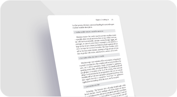 Chapter 8: Timeshifting Life 325 by other persons. Moreover, automated handling of content will require machine-readable descriptions. • Machine-readable metadata is needed for automation Metadata creation: the trend is towards automatic metadata creation – especially when manual annotation does not pay. Online communi- ties will (semi-automatically) annotate content through tagging and ontologies, in cases of content that is meaningful to and desired by a large number of users. Interactions between people in general will turn out to be important sources of metadata. One major metadata creator will be the mass-market industry, spurning out huge amounts of meta- data via product information, advertisements, services, and so forth. • Communities will be a key source of metadata Metadata usage: basic metadata will be commonplace, being adapted to people’s everyday lives. Raw metadata will be mostly invisible to the users, yet it will be everywhere, deeply embedded in applications, operating systems, data, and physical objects. Occasionally people will see glimpses of metadata as the tip of the iceberg, when automatic rating or summarization factors are presented to the user, for example. Metadata will be multi-form and used in unexpected novel ways. Meta- data support becomes a competitive “must have” for applications. Application interworking will be the norm, not the exception. • Good metadata is invisible! Technology: The Semantic Web will make breakthroughs within limited domains. Generic ontologies will still be largely just dreams. Tags and folksonomies will run into complexity and scale-up problems. Decomposition of media items will become commonplace: each indi- vidual media fragment can be uniquely addressed, re-used, and refer- enced. Automatic metadata extraction, with various techniques over multiple content types, becomes the norm. • Upcoming tech: domain-specifi c ontologies, folksonomies, decomposable content, metadata extraction Risks: compromised privacy and bogus metadata will turn out to be the largest initial concerns. Automated metadata extraction from content will improve, but will still guess wrong in cases of more diffi cult content. Non-compatible metadata formats will create a need for