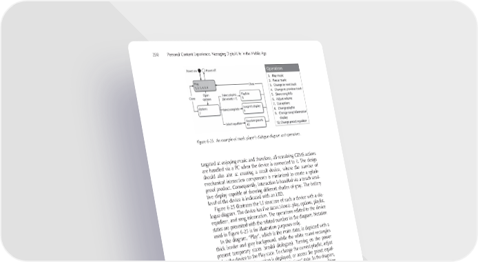 250 Personal Content Experience: Managing Digital Life in the Mobile Age Figure 6-25. An example of music player’s dialogue diagram and operations. targeted at enjoying music and therefore, all remaining GEMS actions are handled via a PC when the device is connected to it. The design should also aim at creating a small device, where the number of mechanical interaction components is minimized to create a splash- proof product. Consequently, interaction is handled via a touch sensi- tive display capable of showing different shades of gray. The battery level of the device is indicated with an LED. Figure 6-25 illustrates the UI structure of such a device with a dia- logue diagram. The device has fi ve states (views): play, options, playlist, equalizer, and song information. The operations related to the device states are presented with the related number in the diagram. Notation used in Figure 6-25 is for illustration purposes only. In the diagram, “Play”, which is the main state, is depicted with a thick border and grey background, while the white round rectangles present temporary states (modal dialogues). Turning on the power takes the device to the Play state. To change the current playlist, adjust the way the song information is displayed, or access the preset equal- izer, the user needs to fi rst move to the “Options” state. In the diagram, access to the “Playlist” is conditional, indicated with the condition inside the brackets. Lastly, the power is switched off, only while in the Play state. The purpose of this dialogue diagram is to depict the required structure and transitions. The designer recognizes what operations are performed in each state and consequently defi nes what kind of UI components are related to it. Furthermore, how the transitions from one state to another are done is defi ned. In mobile UI design, this phase is one of the most essential; if the structure design is poor, the user does not fi nd the desired operations easily. Navigating between