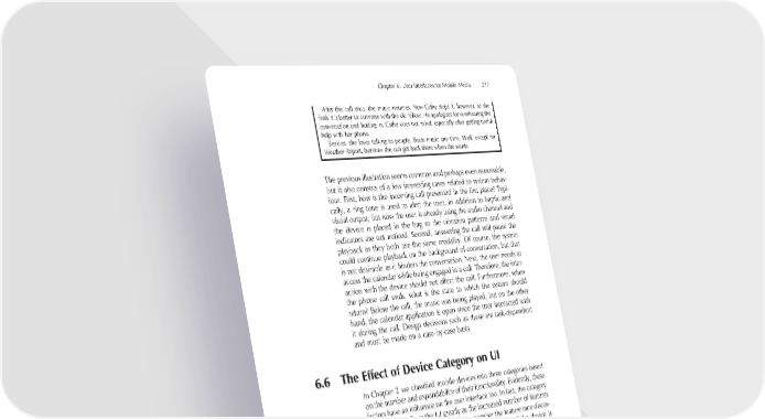 Chapter 6: User Interfaces for Mobile Media 277 After the call ends, the music resumes. Now Cathy stops it, however, as she feels it is better to converse with the old fellow. He apologises for overhearing the conversation and butting in. Cathy does not mind, especially after getting useful help with her phone. Besides, she loves talking to people. Beats music any time. Well, except for Weather Report, but now she can get back there when she wants. The previous illustration seems common and perhaps even reasonable, but it also consists of a few interesting cases related to system behav- iour. First, how is the incoming call presented in the fi rst place? Typi- cally, a ring tone is used to alert the user, in addition to haptic and visual output, but now the user is already using the audio channel and the device is placed in the bag so the vibration patterns and visual indicators are not noticed. Second, answering the call will pause the playback as they both use the same modality. Of course, the system could continue playback on the background of conversation, but that is not desirable as it hinders the conversation. Next, the user needs to access the calendar while being engaged in a call. Therefore, the inter- action with the device should not affect the call. Furthermore, when the phone call ends, what is the state to which the system should return? Before the call, the music was being played, but on the other hand, the calendar application is open since the user interacted with it during the call. Design decisions such as these are task-dependent and must be made on a case-by-case basis. 6.6 The Effect of Device Category on UI In Chapter 2 we classifi ed mobile devices into three categories based on the number and expandability of their functionality. Evidently, these factors have an infl uence on the user interface too. In fact, the category of the device affects the UI greatly as the increased number of features require more fl exibility from the UI (remember the feature race discus- sion at the beginning of this chapter?). For example, if the device is only dedicated to audio playback, the UI should refl ect this aspect and provide fast and easy access to the core operations related to this task. On the other hand, the UI of a toolbox device should be fl exible enough to support a wide range of different tasks. To make things even more interesting, all possible tasks for a toolbox device are not even known at the time of the device design (since the platform is open for further (third party) application development). The user interface of dedicated media devices is normally minimal; only the controls for the most frequent actions involved in primary