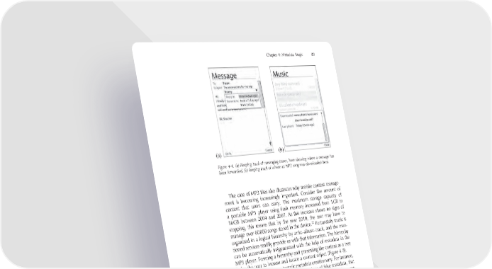 Chapter 4: Metadata Magic 89 (a) (b) Figure 4-4. (a) Keeping track of messaging traces, here showing where a message has been forwarded, (b) keeping track of where an MP3 song was downloaded from. The case of MP3 fi les also illustrates why mobile content manage- ment is becoming increasingly important. Consider the amount of content that users can carry. The maximum storage capacity of a portable MP3 player using fl ash memory increased from 1 GB to 16 GB between 2004 and 2007. As this increase shows no signs of stopping, this means that by the year 2010, the user may have to 22 manage over 60 000 songs stored in the device. Fortunately music is organized in a logical hierarchy by artist–album–track, and the men- tioned services readily provide us with that information. The hierarchy can be automatically (re)generated with the help of metadata in the MP3 player. Forming a hierarchy and presenting the content as a tree helps the user to browse and locate a content object (Figure 4-5). The issues related to automatic metadata creation vary. For instance, one should carefully consider the implications of false metadata, that is, the consequences of a situation in which the automatically gener- ated metadata is incorrect. In many personal content-related cases, the result is not severe. For example, the number of people in an image might just exclude the photo from a scenario which it belongs to. Or, if you invest 99 cents into a song based on some misleading metadata and then realize that the content is not exactly what you expected, the economical loss is regrettable but not lethal. 22 We applied the same formula that Apple uses for their iPod: one GB holds 240 songs, which are 4 minutes long and encoded with 128 kbit/s AAC coding.