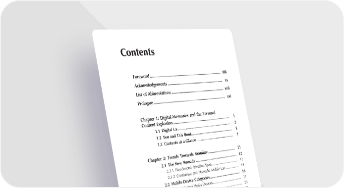 Contents Foreword ......................................................................... xiii Acknowledgements ......................................................... xv List of Abbreviations ....................................................... xvii Prologue .......................................................................... xxi Chapter 1: Digital Memories and the Personal Content Explosion ........................................................... 1 1.1 Digital Us ............................................................ 2 1.2 You and This Book .............................................. 5 1.3 Contents at a Glance ......................................... 7 Chapter 2: Trends Towards Mobility ............................. 11 2.1 The New Nomads ............................................... 12 2.1.1 Five-Second Attention Span ................................. 13 2.1.2 Continuous and Nomadic Mobile Use ................. 15 2.2 Mobile Device Categories ................................... 16 2.2.1 Dedicated Media Devices .................................... 17 2.2.2 Swiss Army Knives................................................ 20 2.2.3 Toolbox Devices .................................................. 21 2.2.4 Accessories and Other Devices ............................ 24 2.3 Mobile Compromises .......................................... 25 2.3.1 Teeny Weeny UIs ................................................ 30 2.4 Because it Can! ................................................... 30 2.5 Convergence ........................................................ 31 2.6 Wireless Revolution ............................................ 33