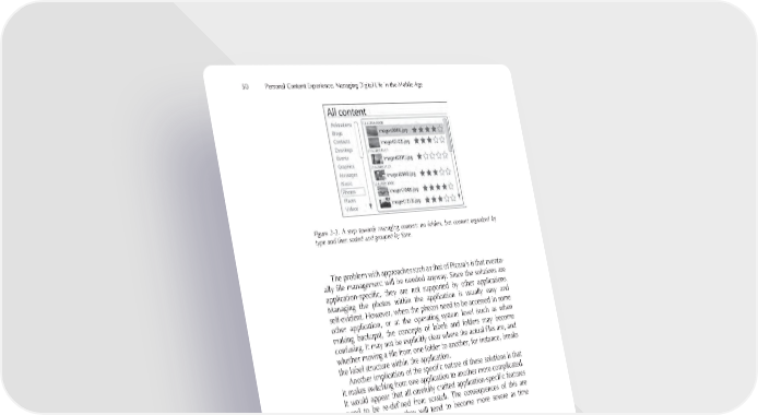50 Personal Content Experience: Managing Digital Life in the Mobile Age Figure 3-3. A step towards managing content: no folders, but content organized by type and then sorted and grouped by time. The problem with approaches such as that of Picasa’s is that eventu- ally fi le management will be needed anyway. Since the solutions are application-specifi c, they are not supported by other applications. Managing the photos within the application is usually easy and self-evident. However, when the photos need to be accessed in some other application, or at the operating system level (such as when making backups), the concepts of labels and folders may become confusing. It may not be explicitly clear where the actual fi les are, and whether moving a fi le from one folder to another, for instance, breaks the label structure within the application. Another implication of the specifi c nature of these solutions is that it makes switching from one application to another more complicated. It would appear that all carefully crafted application-specifi c features need to be re-defi ned from scratch. The consequences of this are yet to be seen, as they will tend to become more severe as time goes by. EASY COME, EASY GO A few years ago Cathy had a digital camera. She used it extensively at fi rst, shooting pictures of everything, particularly all the fl owers and plants in the neighbourhood. She then uploaded the images to her computer and added keywords to the pictures with the FotoX application her friend recommended. She spent months compiling a database of pictures of different herbs, with unusual labels (i.e., “breaking his nose”). That database would come in handy later when she needed to fi nd a certain plant to describe particular emotions.